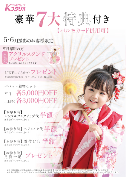 ※特典4〜7のお参り時の特典は、Kスタジオでお参り衣装のレンタルをご利用いただいた方限定となります。